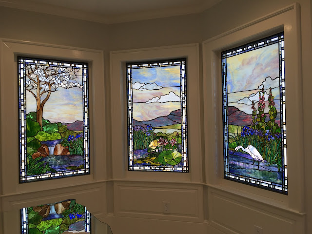 Drapery glass as much as an inch thick was used in the tulip tree blossoms, lotus blossoms, and waterfall which made soldering the backside of these panels a real pain.